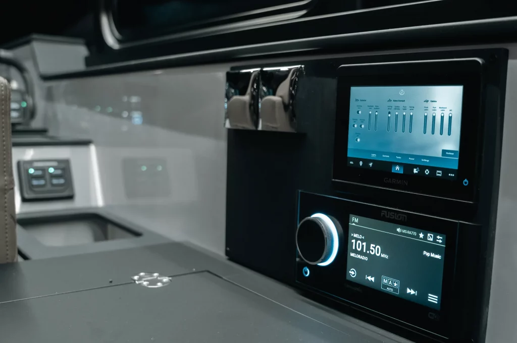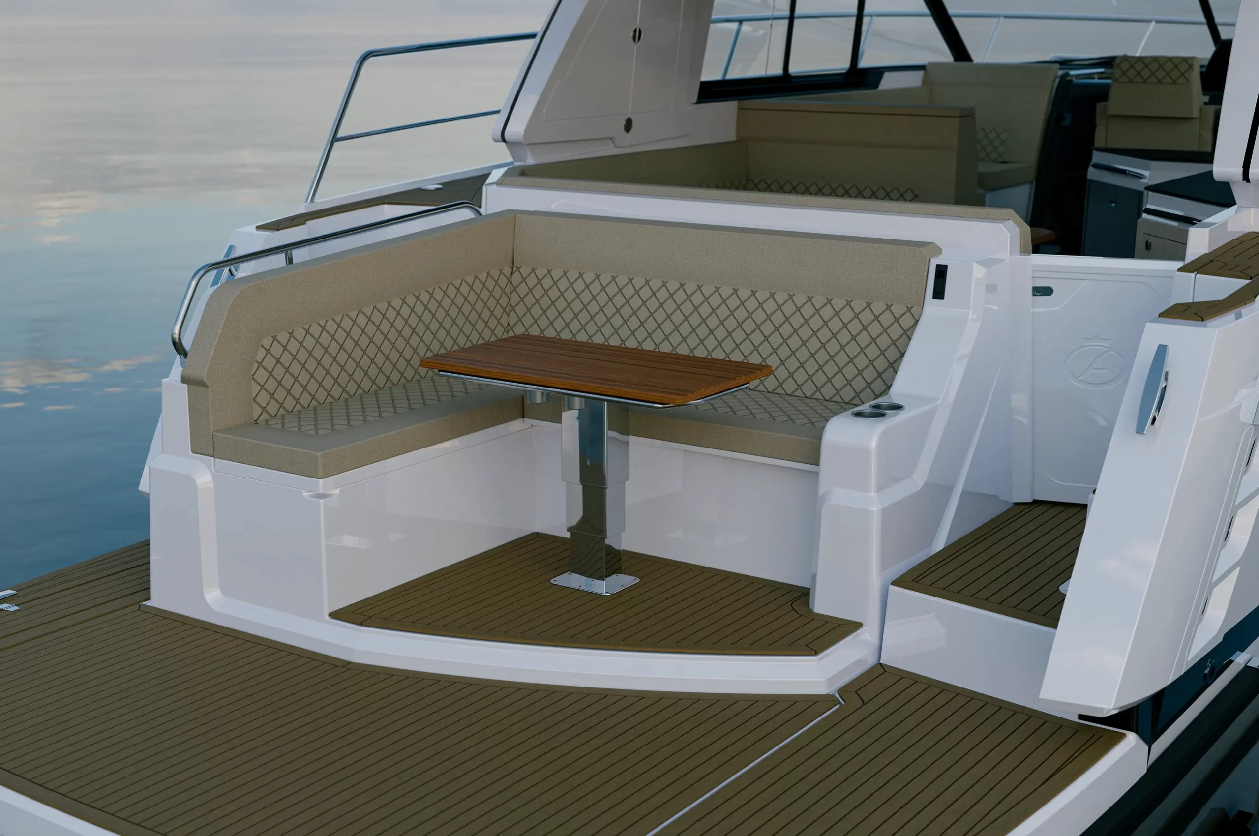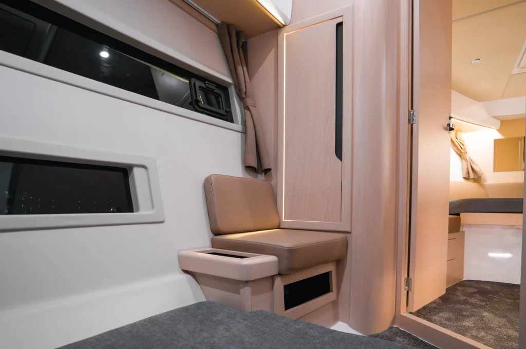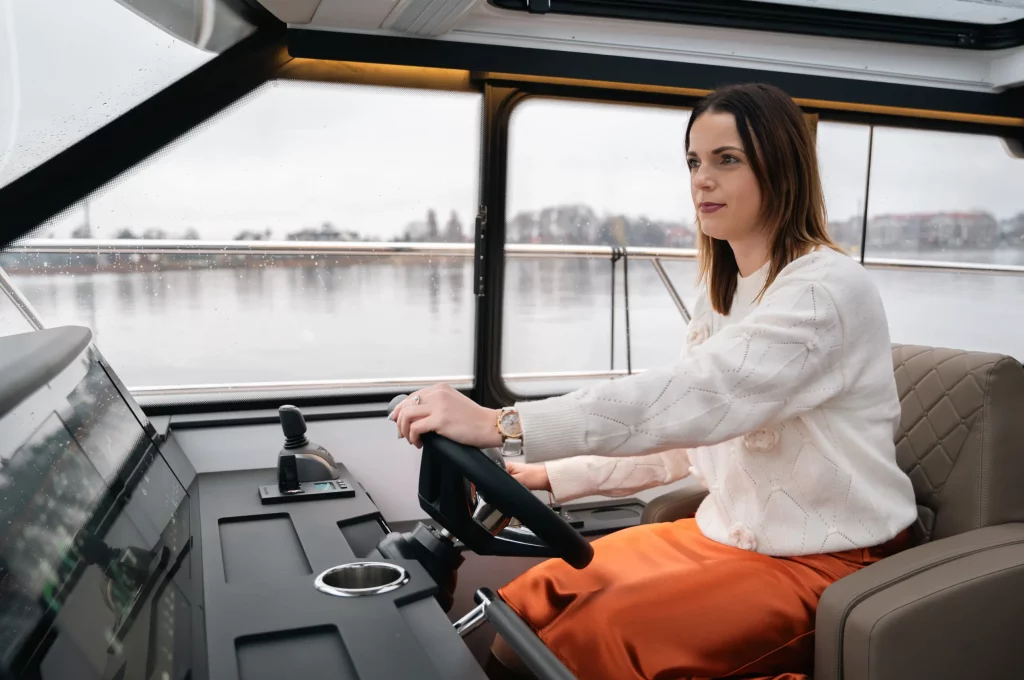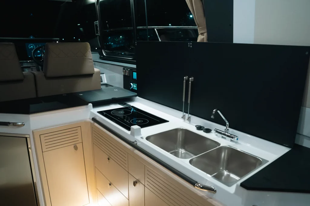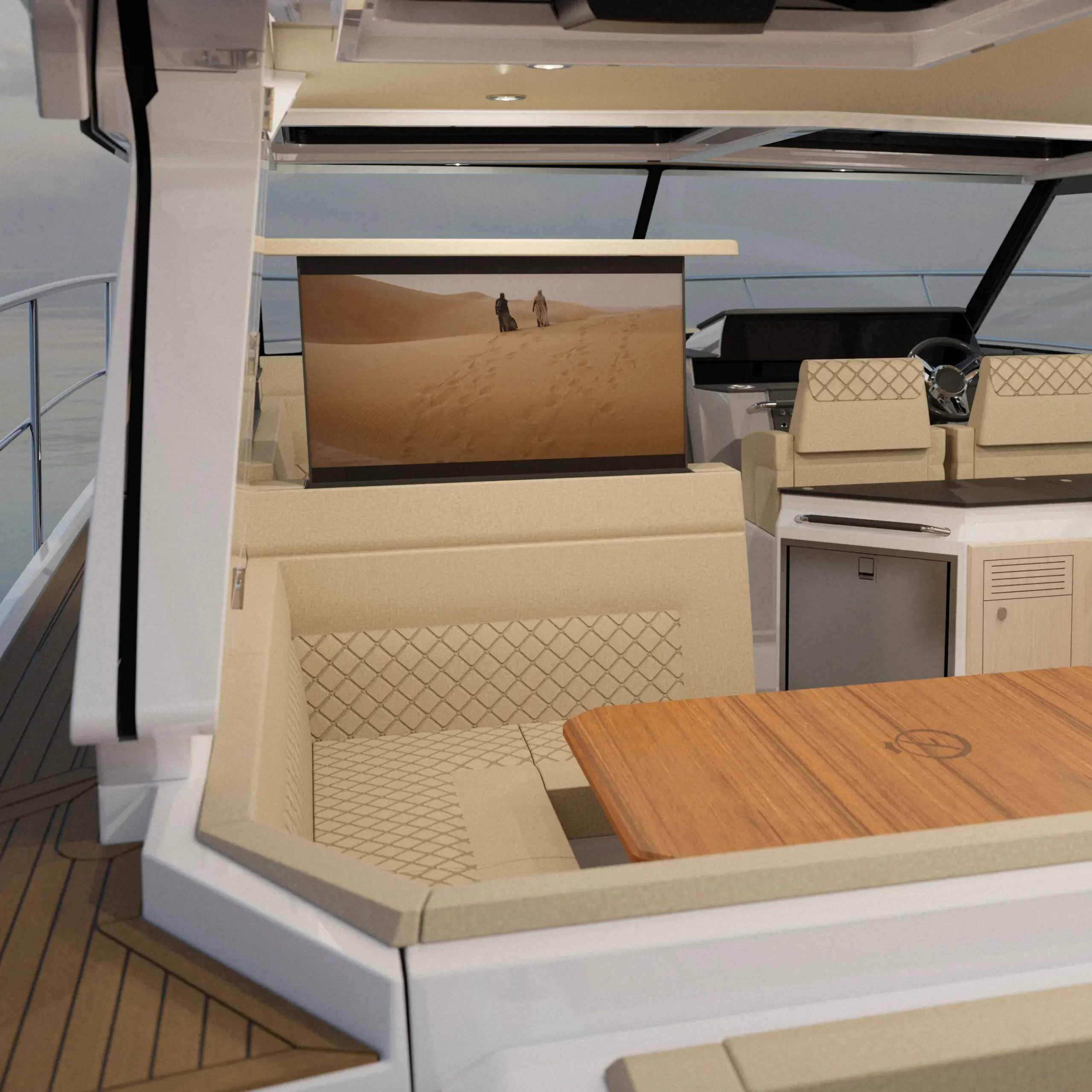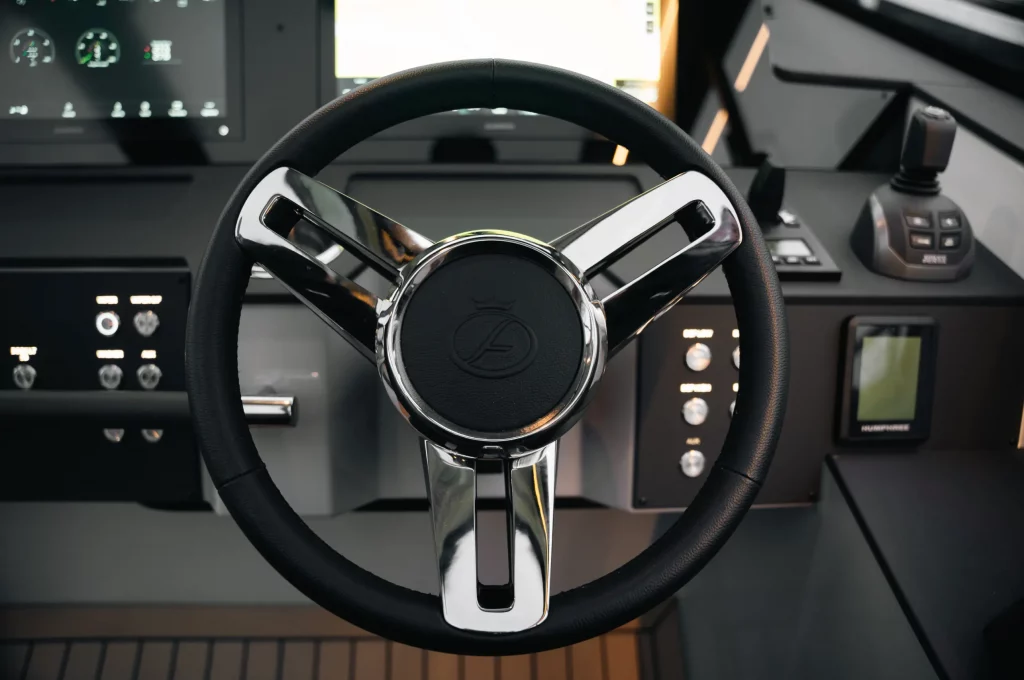 Grazie alla possibilità di scegliere fino a due schermi multifunzione da 16”, il controllo dei sistemi dell’imbarcazione sarà sempre a portata di mano. Tracciate la rotta da soli o accomodatevi comodamente con i vostri cari sul doppio sedile di guida. La posizione del copilota è unica, con sedili rivolti in avanti o all’indietro, oppure trasformabili in chaise longue per il massimo comfort durante le crociere più lunghe. Tutti i comandi sono posizionati ergonomicamente e, per una vista panoramica, basta aprire i portelli sul tetto e alzarsi in piedi per sentire la brezza marina tra i capelli.