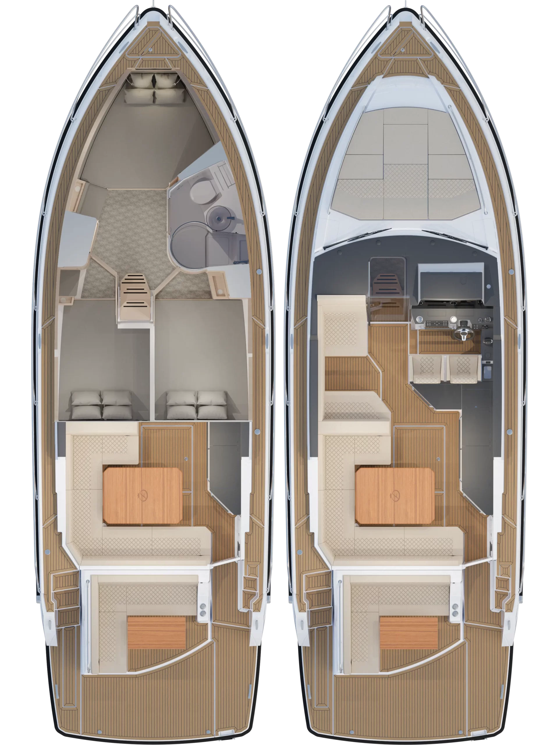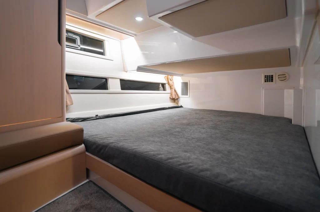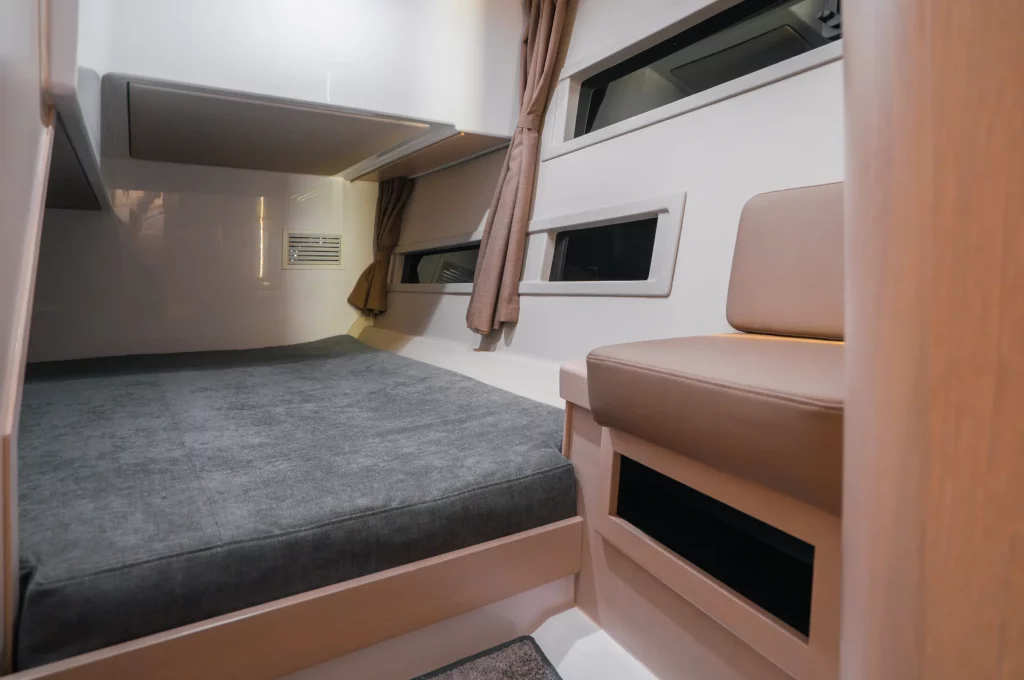 Con una disposizione a tre cabine e otto posti letto complessivi, potrete prolungare le vostre avventure in barca e creare la perfetta notte di sonno per tutta la famiglia. Ogni cabina e il design degli interni sono ben studiati per sfruttare al meglio lo spazio disponibile.