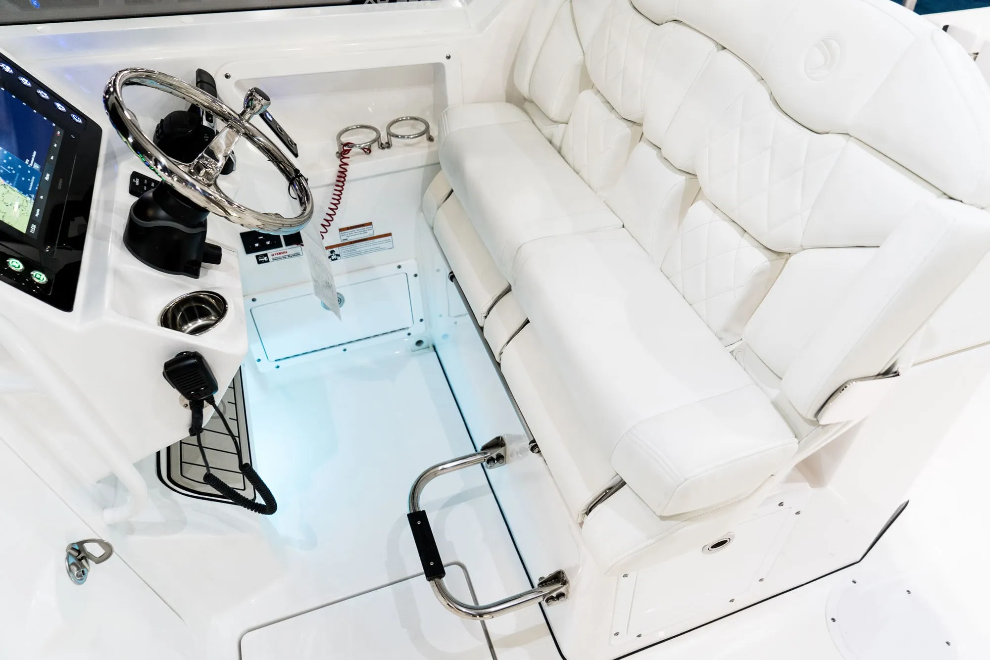 Le comode poltrone del capitano, il poggiapiedi pieghevole, i portabicchieri in acciaio inox disposti in ogni direzione e l’illuminazione a LED trasformano questa zona di comando in un’elegante zona di guida.